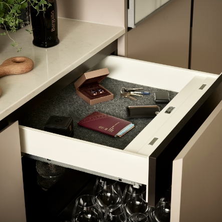Progettata per integrarsi in un mobile da cucina, fornendo ai proprietari uno spazio sicuro e comodamente accessibile per riporre i loro oggetti più preziosi e oggetti di valore di tutti i giorni.